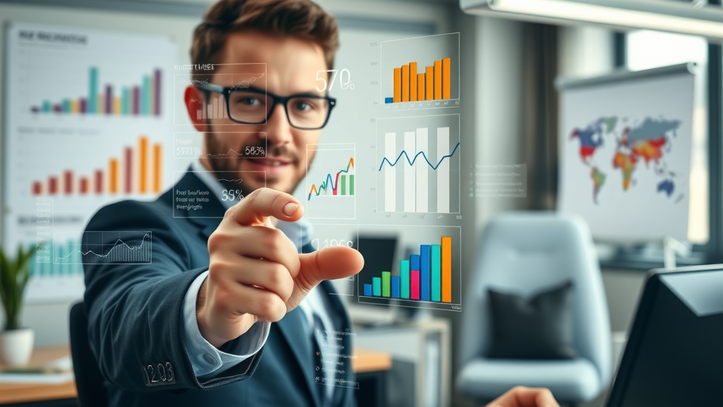 Striking infographic visualization illustrating statistics on goal achievement in a professional setting, relating to short term vs long term goals. Lifelike office scene with charts and data, vibrant analysis tools, soft natural lighting.