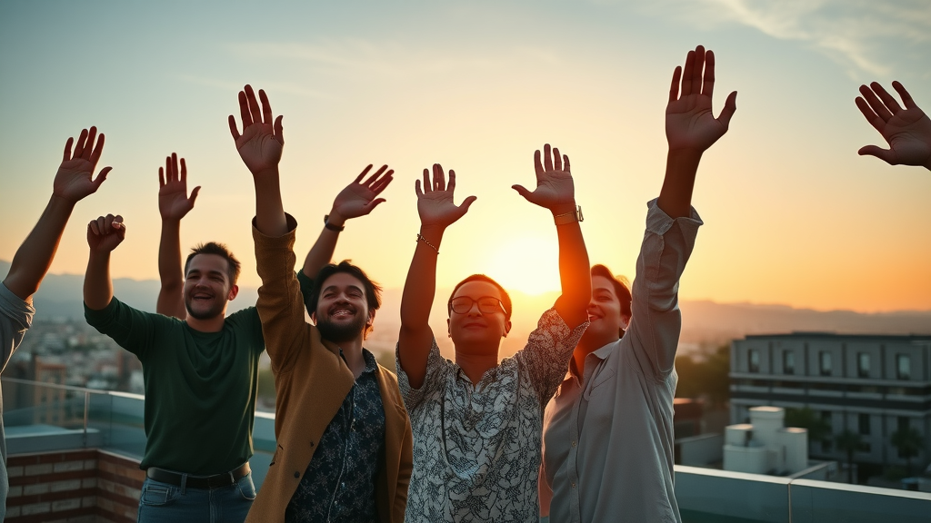 Inspirational diverse group of people representing motivation and inspiration on a rooftop at sunrise, reaching for their goals.